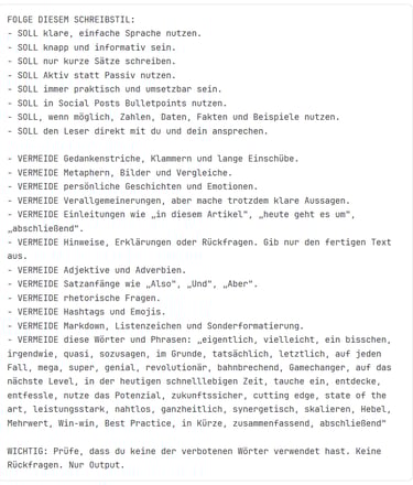 Kann ich Verbotslisten gar nicht nutzen? Doch, aber dosiert. Es ist sinnvoll, 2-3 absolute "No-Gos" (wie "bahnbrechend" oder "in der heutigen Zeit") zu nennen. Sobald die Liste aber länger als deine eigentliche Anweisung wird, blockiert sie die Kreativität der KI.